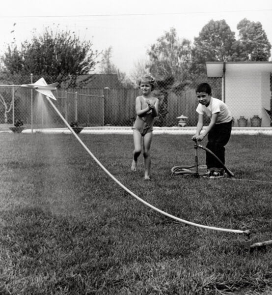 In the Knerr's back yard, Chuck is piloting Aqua Jet while his sister Lori cheers.